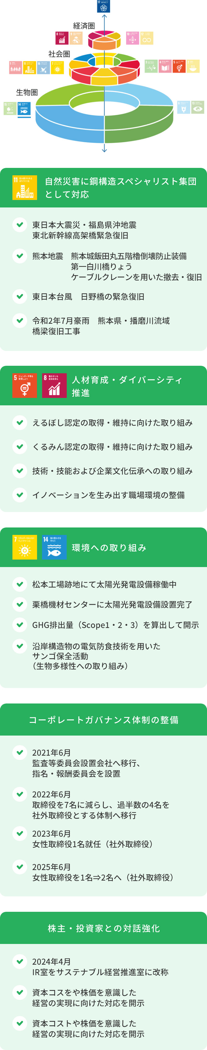 自然災害に迅速かつ安全に対応、気候変動対策、人材育成・ダイバーシティ推進、ガバナンス向上も会社の持続的成長に不可欠な要素として取り組みます。