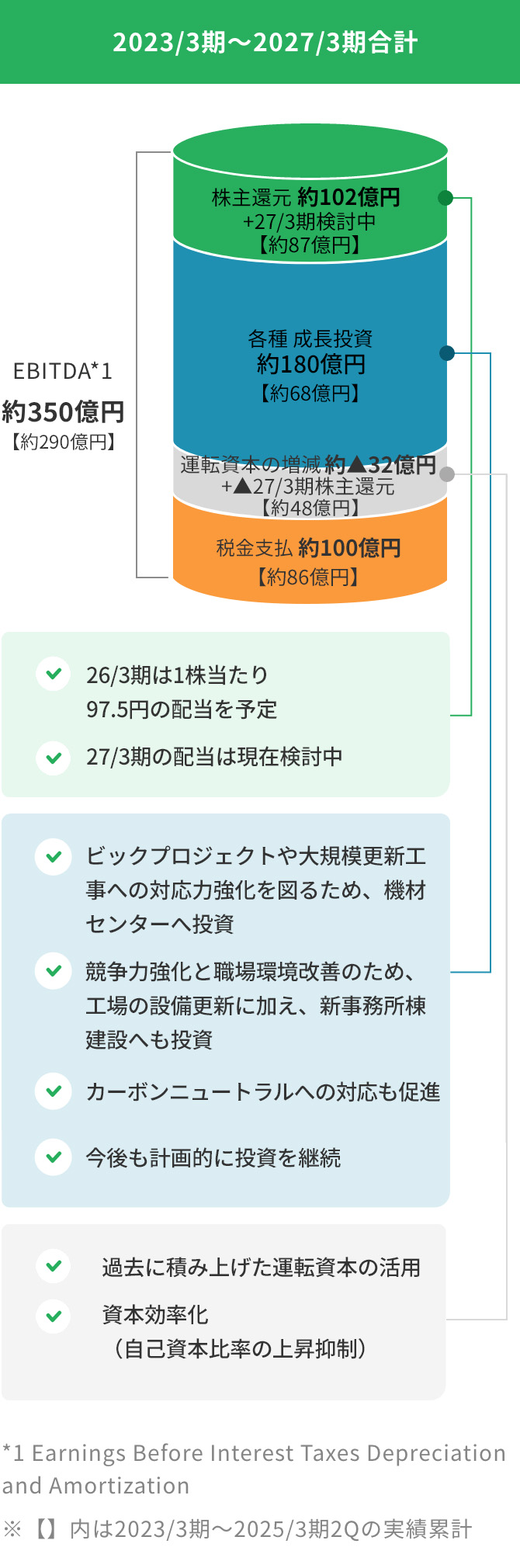 一定の資本拡充および成長投資も確保の上で、株主還元の維持・拡大を図ります。具体的には、中期経営計画の期間内に稼ぎ出すEBITDAについて約400億円を見込んでおり、成長投資に約180~200億円を投じる予定です。また、株主還元として総還元性向60%を目安に還元を維持・拡大していく予定です。