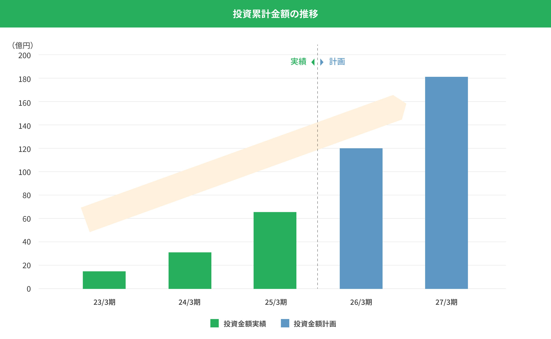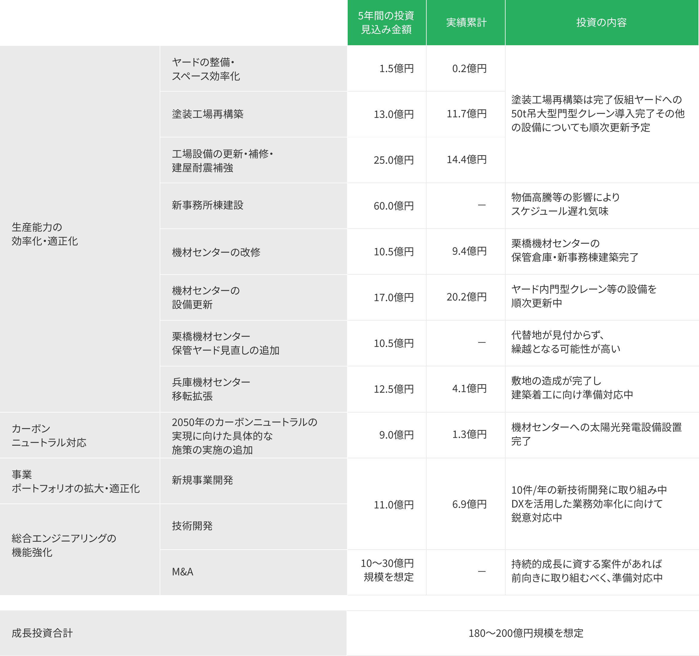 生産性向上に向けた投資の他に、新規事業開発や総合エンジニアリングの機能強化に向けて30~50億円規模の投資を想定しています。総額では約180~200憶円の投資を見込んでいます。