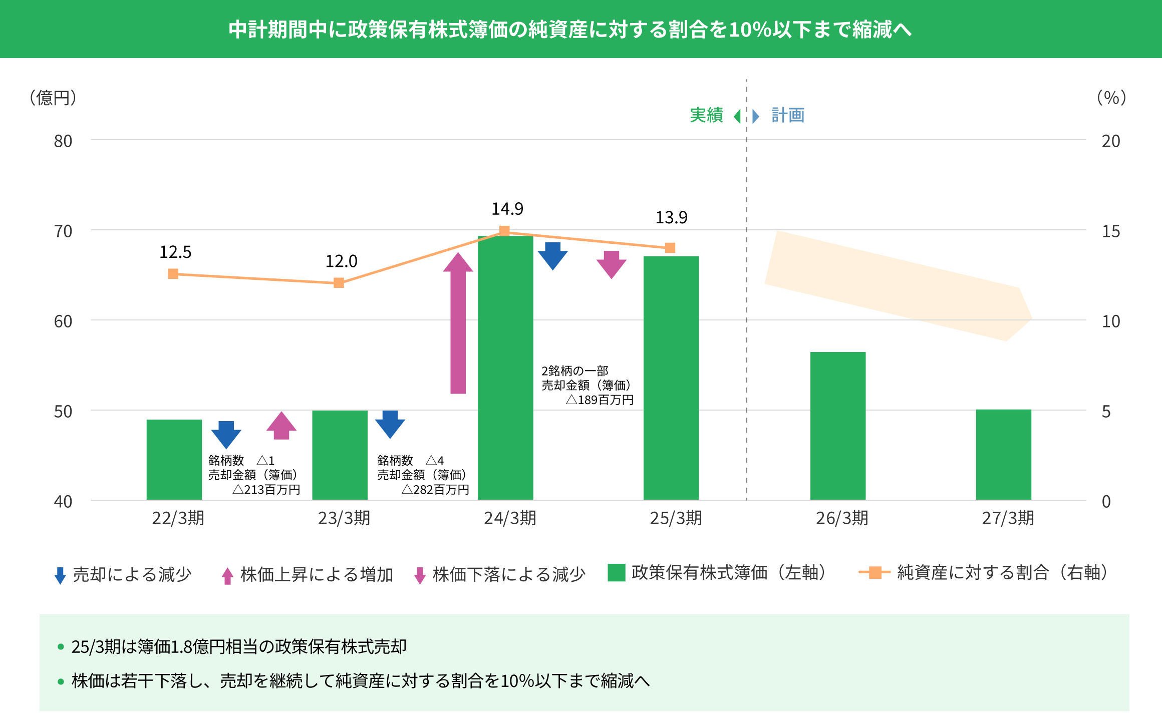 現中計期間中に、純資産に対する政策保有株式簿価の割合を10%以下にまで縮減する計画です。