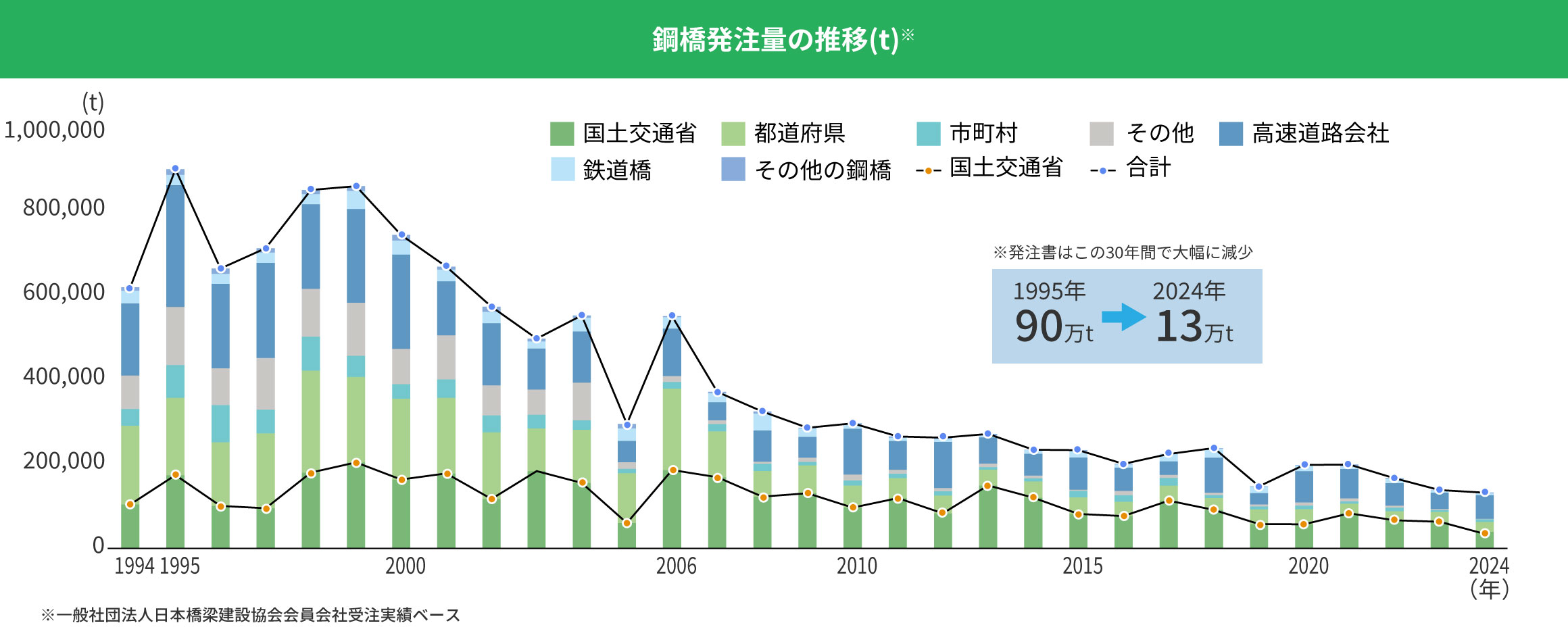 公共投資は、関連予算で見ると補正予算の効果もあって金額ベースでは堅調に推移しているものの、鋼製橋梁の新設関連工事においては、物価上昇などの影響により重量ベースでの発注量が減少傾向にあります。