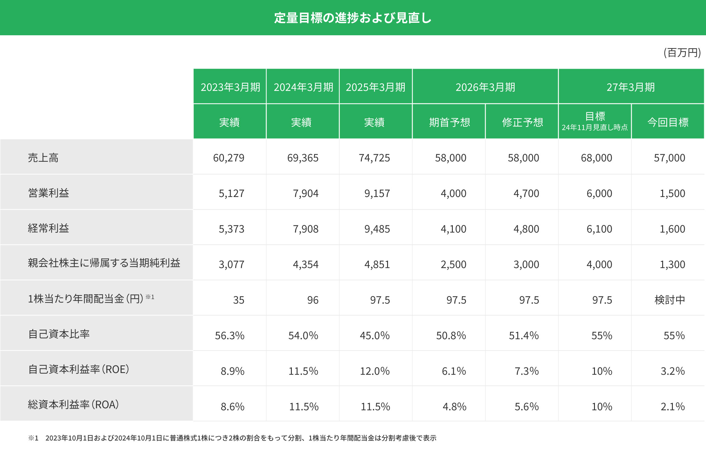 このような状況を踏まえ、2026年3月期第2四半期決算説明会(2025年11月)において、現中期経営計画(2022~2026年度)の最終年度となる2027年3月期の達成目標の見直しを行いました。