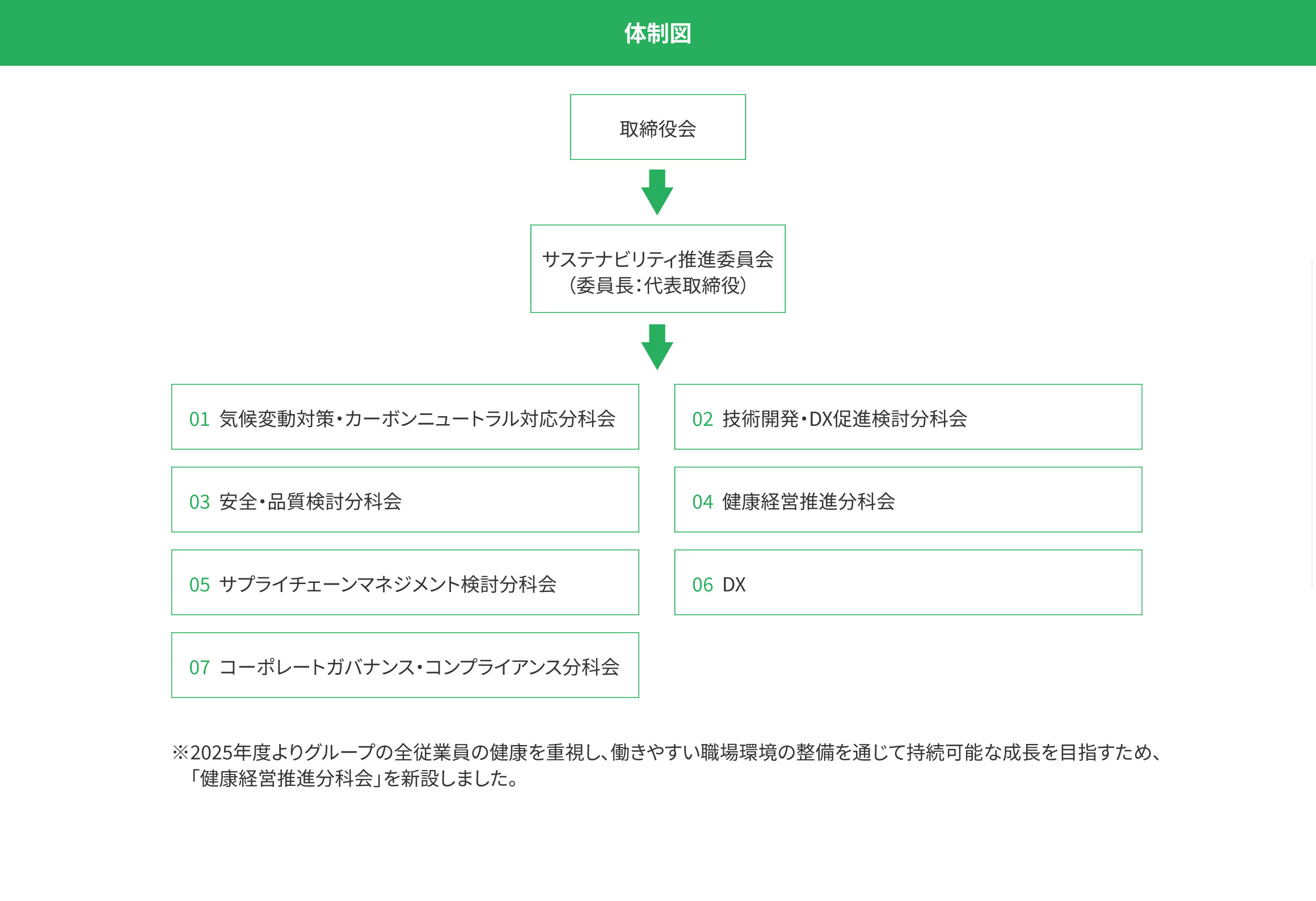 各目標およびKPIの達成に向けて、サステナビリティ推進委員会の下に7つの分科会を設置し、グループ一丸となって取り組んでいます。