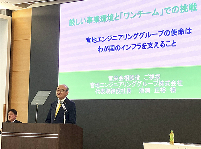 続いて、池浦 正裕 相談役(宮地エンジニアリンググループ株式会社代表取締役社長)より、協力会社への感謝とともに、グループの歴史や挑戦、『ワンチーム』としての取り組み、安全の徹底、未来を共に創るパートナーシップが重要であると挨拶があり、協力会社との信頼関係を軸に新たな価値を創造していく決意が表明されました。