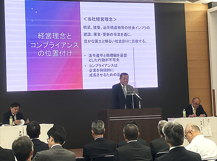続いて、平島 崇嗣 理事(宮地エンジニアリンググループ株式会社 取締役)より、「安全衛生・コンプライアンス推進強化について」と題した講話がありました。